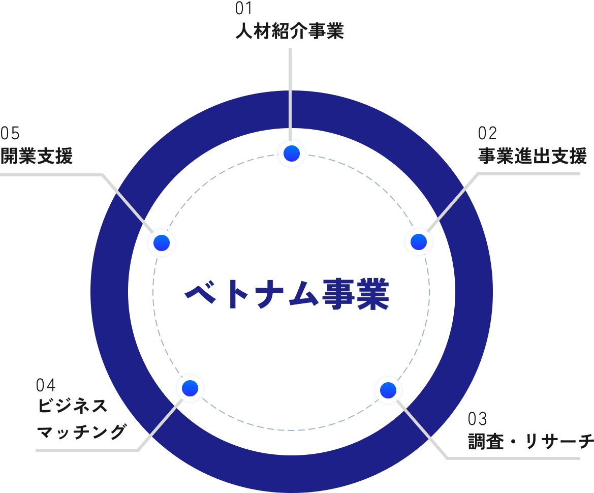 ベトナムに進出されたい企業様のフルサポートを行っております。ベトナムにも現地法人がある強みを生かし、工場・サービス業など店舗(工場)誘致、ライセンスの取得、店舗(工場内)の内装業者の手配からスタッフ採用、マーケティングまでのフルサポートのご提案が最大の強みです。