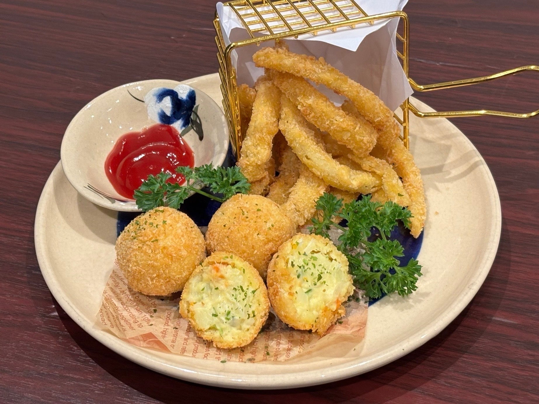 ポテサラボール&オニオンフライ Combo bánh khoai tây chiên xù & hành tây giòn rụm Ffried Mashed Potato & Fried Onion