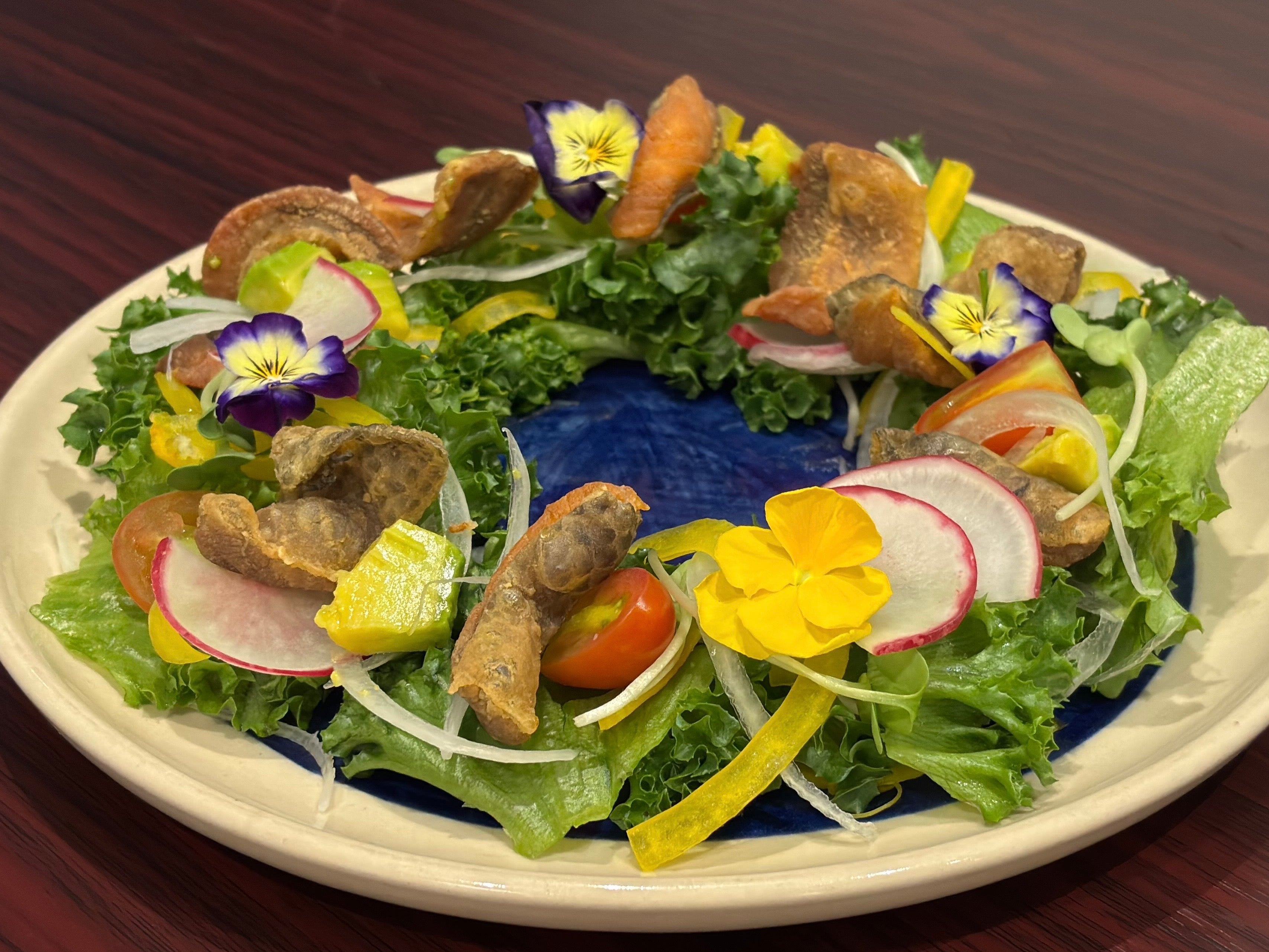 サーモンスキンのピリ辛シーザーサラダ Salad da Cá Hồi sốt cay Fried Salmon Skin Salad With Spicy Caesar Dressing